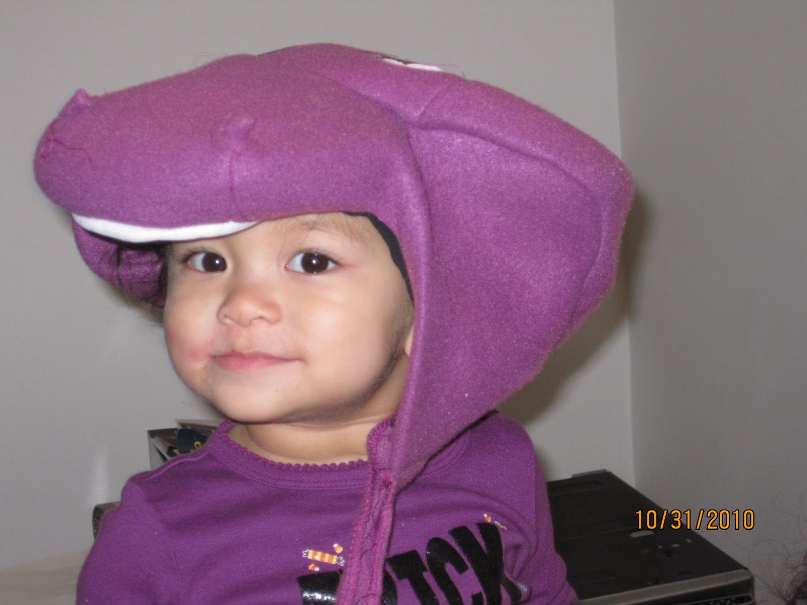 Lil' Ms. Barney on Halloween!! Didn't want to keep the hat part on, but didn't mind sporting the costume.